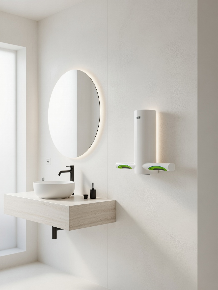 Сушилка изготовлена из высококачественных материалов, которые полностью безопасны и не токсичны. Не высокий уровень потребляемой мощности + EAS система + высокая скорость сушки рук — все это значительно экономит электроэнергию.